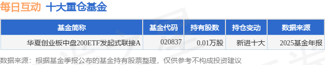 根据2025基金年报公募基金重仓股数据,重仓该股的公募基金共1家,其中持有数量最多的公募基金为华夏基金的华夏创业板中盘200ETF发起式联接A。华夏创业板中盘200ETF发起式联接A目前规模为0.24亿元,最新净值1.5388(4月8日),较上一交易日上涨5.43%,近一年上涨45.71%。该公募基金现任基金经理为刘蔚。刘蔚在任的基金产品包括:创业板200ETF华夏,管理时间为2026年1月16日至今,期间收益率为-14.35%;石油ETF华夏,管理时间为2026年3月11日至今,期间收益率为-1.6%;电池ETF华夏,管理时间为2026年3月11日至今,期间收益率为-7.83%。